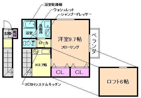| 設備 | セパレート、TVモニターホン、システムキッチン、シャンプードレッサー、独立洗面台、ウォシュレット、CATV、IHコンロ、クローゼット、エアコン、ロフト | ||